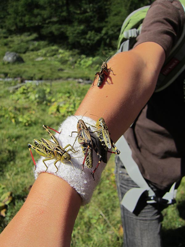 Sur le chemin du retour, mon grand frère a découvert un troupeau de sauterelles et, pour en garder un souvenir, il en a rapporté une à la maison.