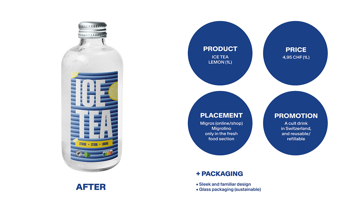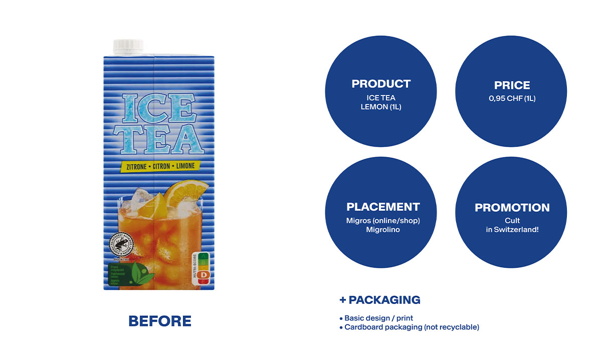 “Ice Tea” is a marketing project carried out in 2025 as part of a seminar at the school of applied arts. The objective was to select a food product sold at Migros, then multiply its price by five, while keeping the same ingredients and quantity. The only variables that could be changed were the packaging, store positioning, and promotional strategy—essential elements to justify this price increase.