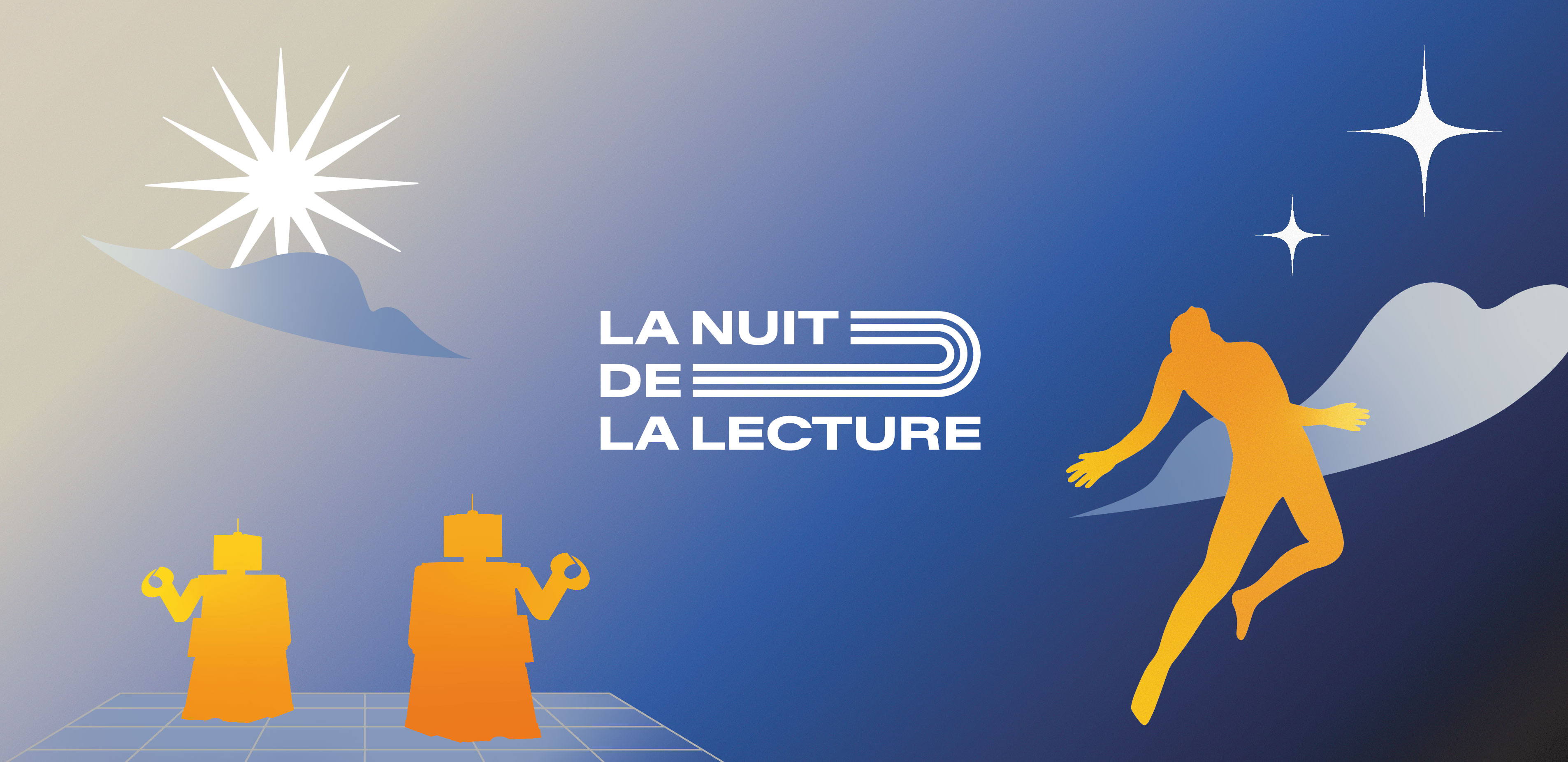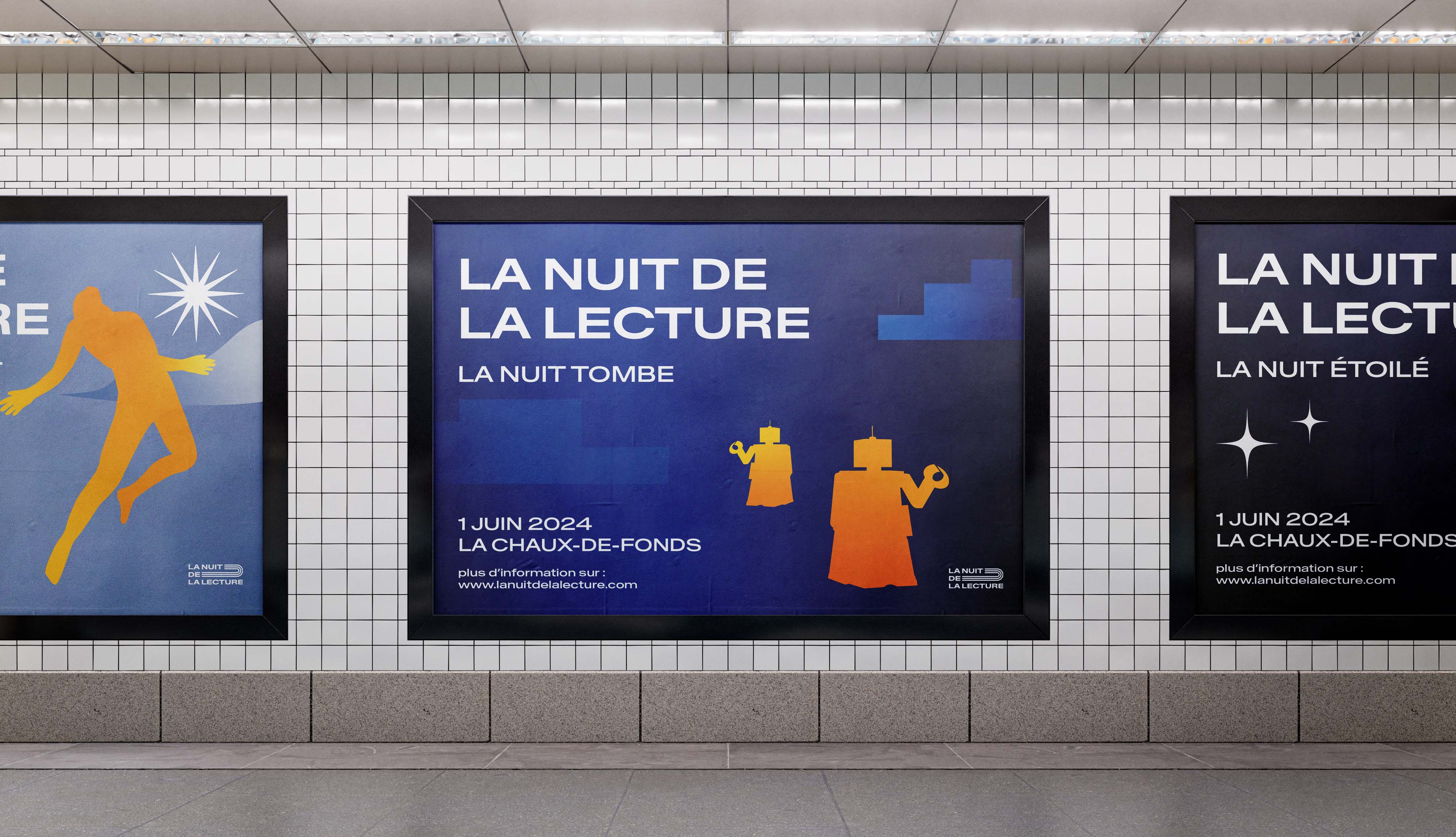 À partir du nom de l’événement, du thème et du lieu, il a été possible de concevoir l’ensemble de l’identité, du site et de la vidéo de manière cohérente. Le logo s’inspire de la forme d’un livre fermé combiné à un croissant de lune, faisant référence à la lecture nocturne. Pour la palette de couleurs, les tons bleu et jaune du drapeau de La Chaux-de-Fonds ont été adaptés au concept : le bleu s’assombrit au fil de la soirée, représentant le ciel qui se fait nuit, tandis que le jaune symbolise le thème central et évolue selon le contexte. Cette approche permet de rendre l’identité visuelle adaptable à différents thèmes au fil des années.